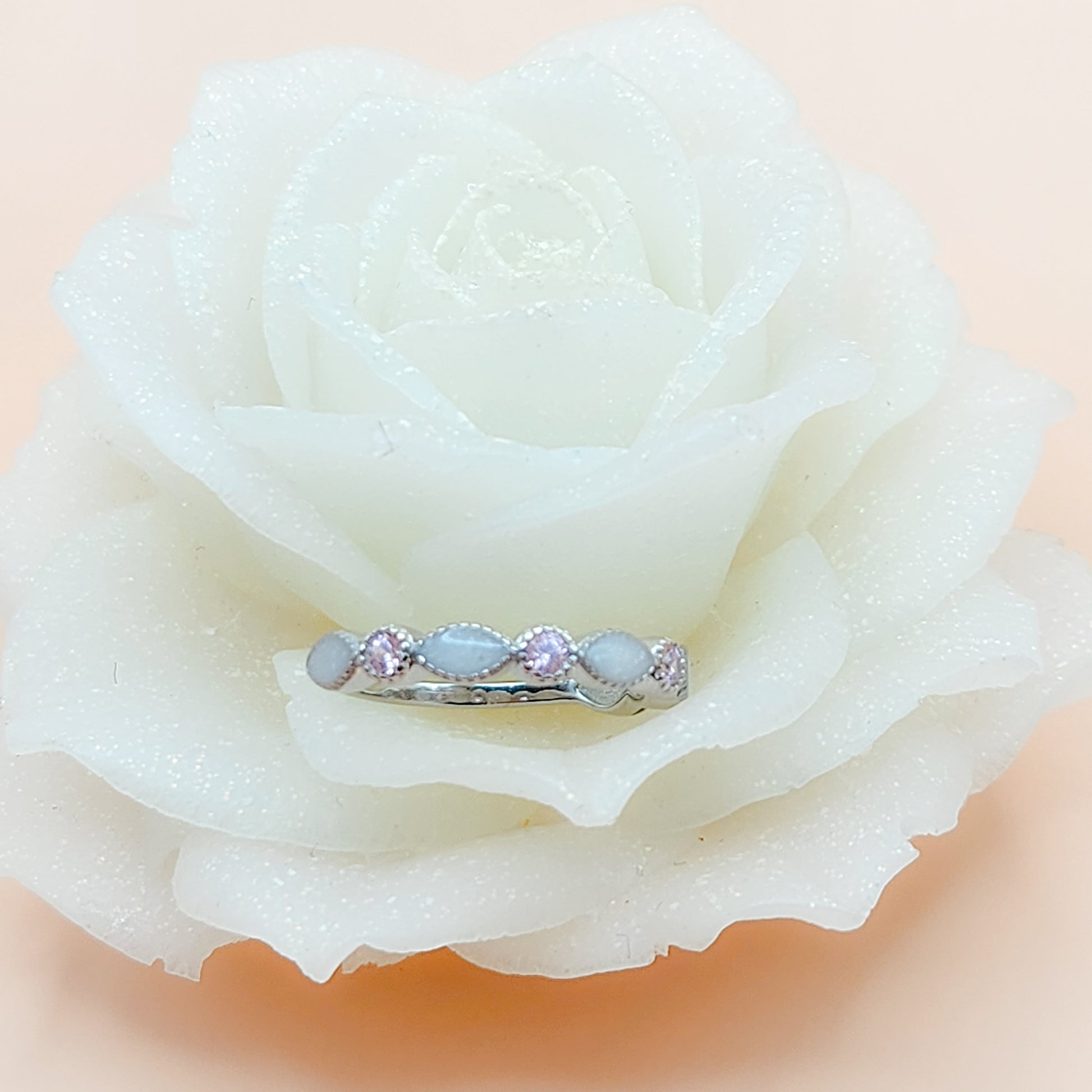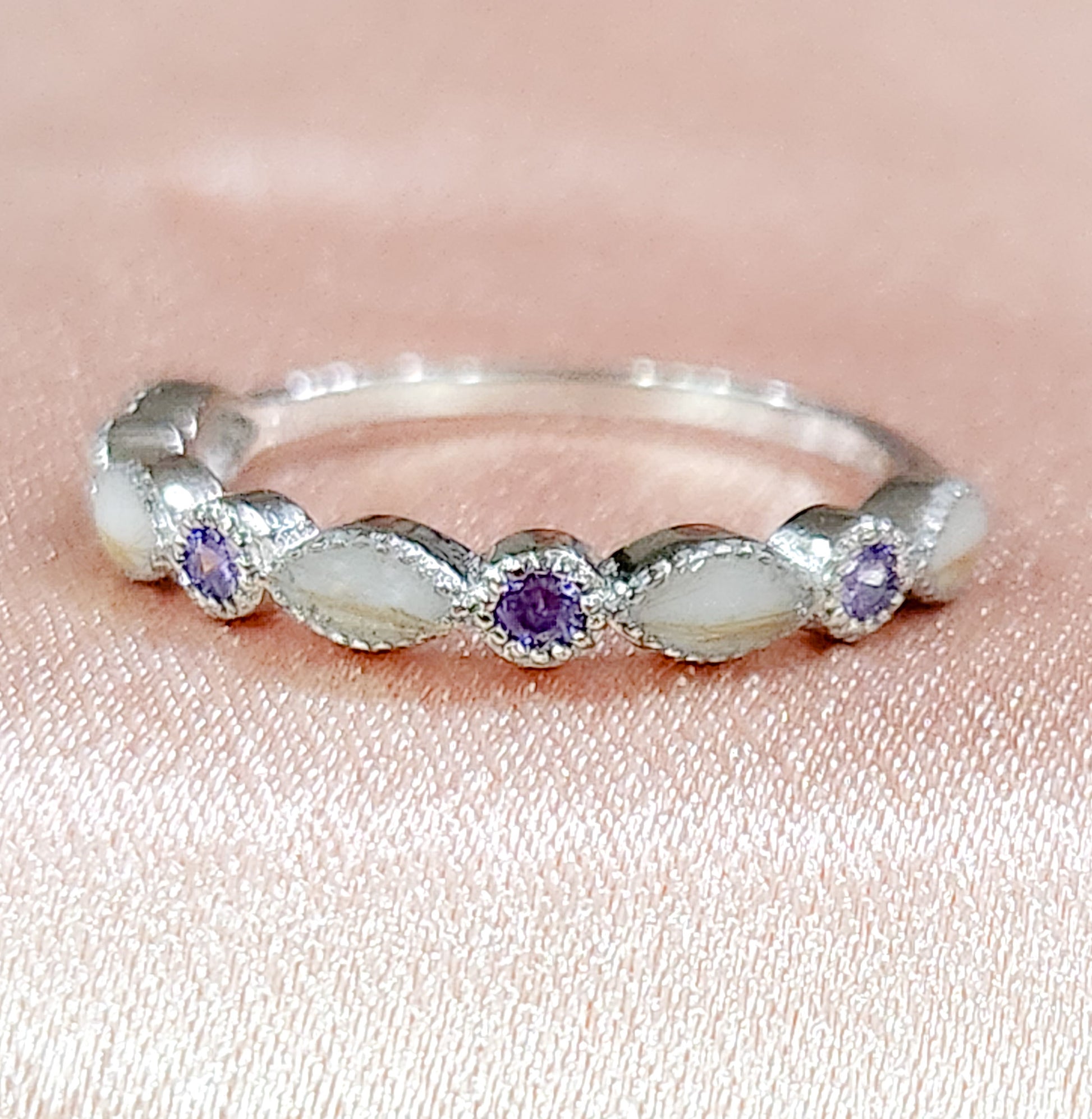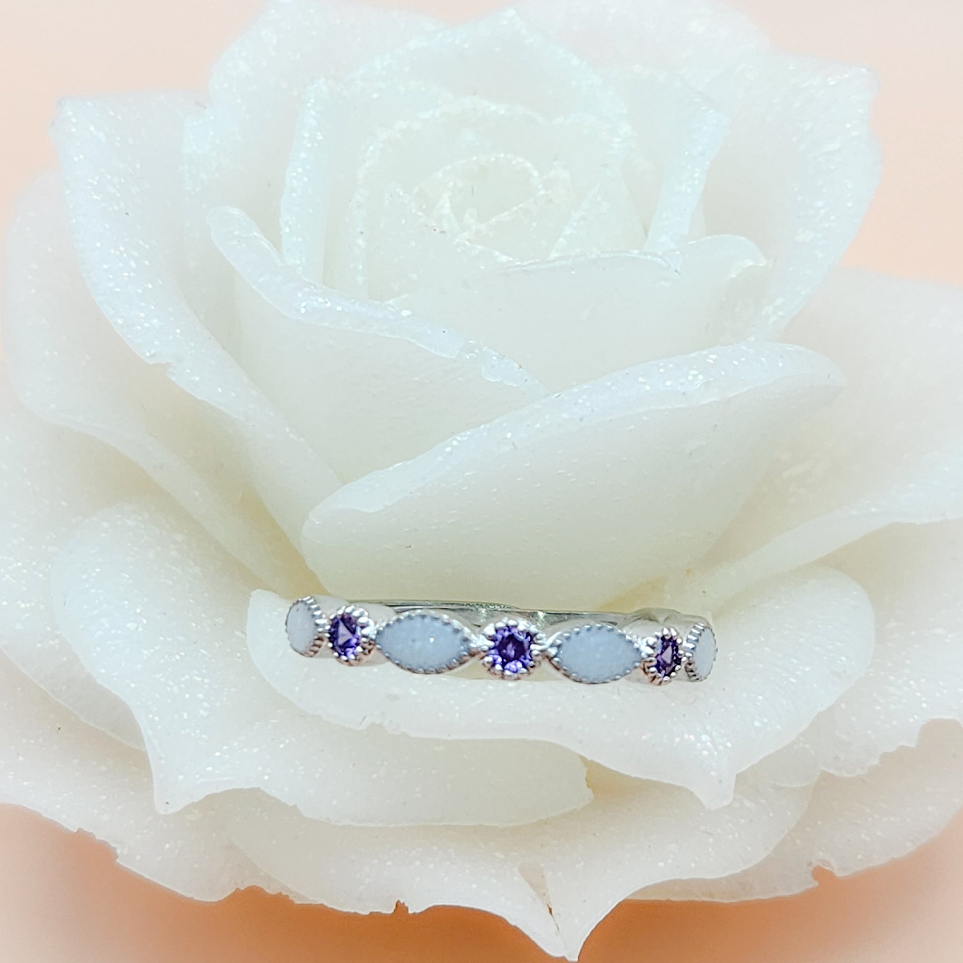 This enchanting 925 sterling silver ring features a half band of bezels with 4 birthstone coloured cubic zirconia accent stones. If you would prefer to keep the stones clear please select April. This setting is available in silver, gold, or rose gold plating. Please note that you may only select up to 4 birthstones for this setting.