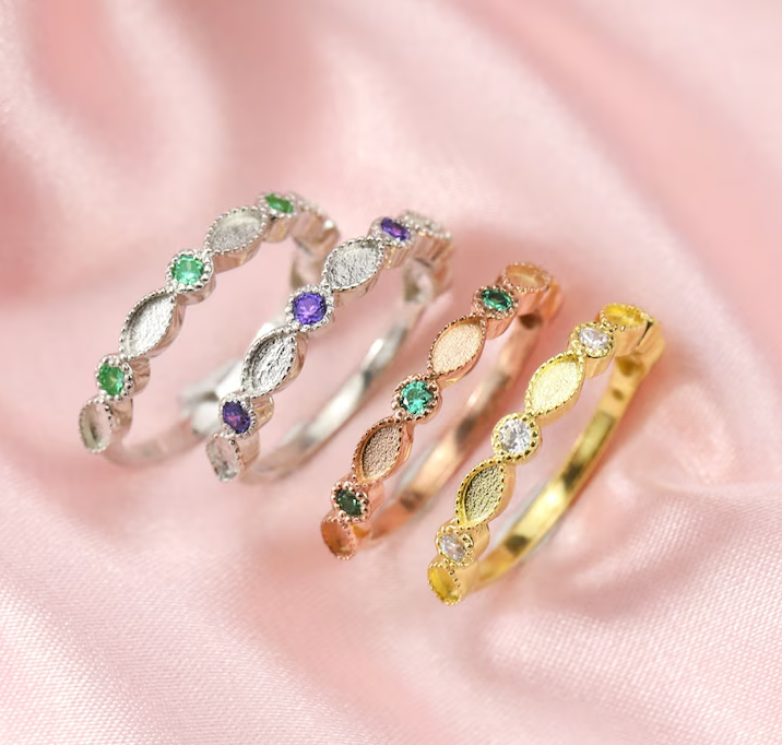 This enchanting 14K gold ring features a half band of bezels with 4 birthstone coloured cubic zirconia accent stones. If you would prefer to keep the stones clear please select April. This setting is available in silver, gold, or rose gold plating. Please note that you may only select up to 4 birthstones for this setting.