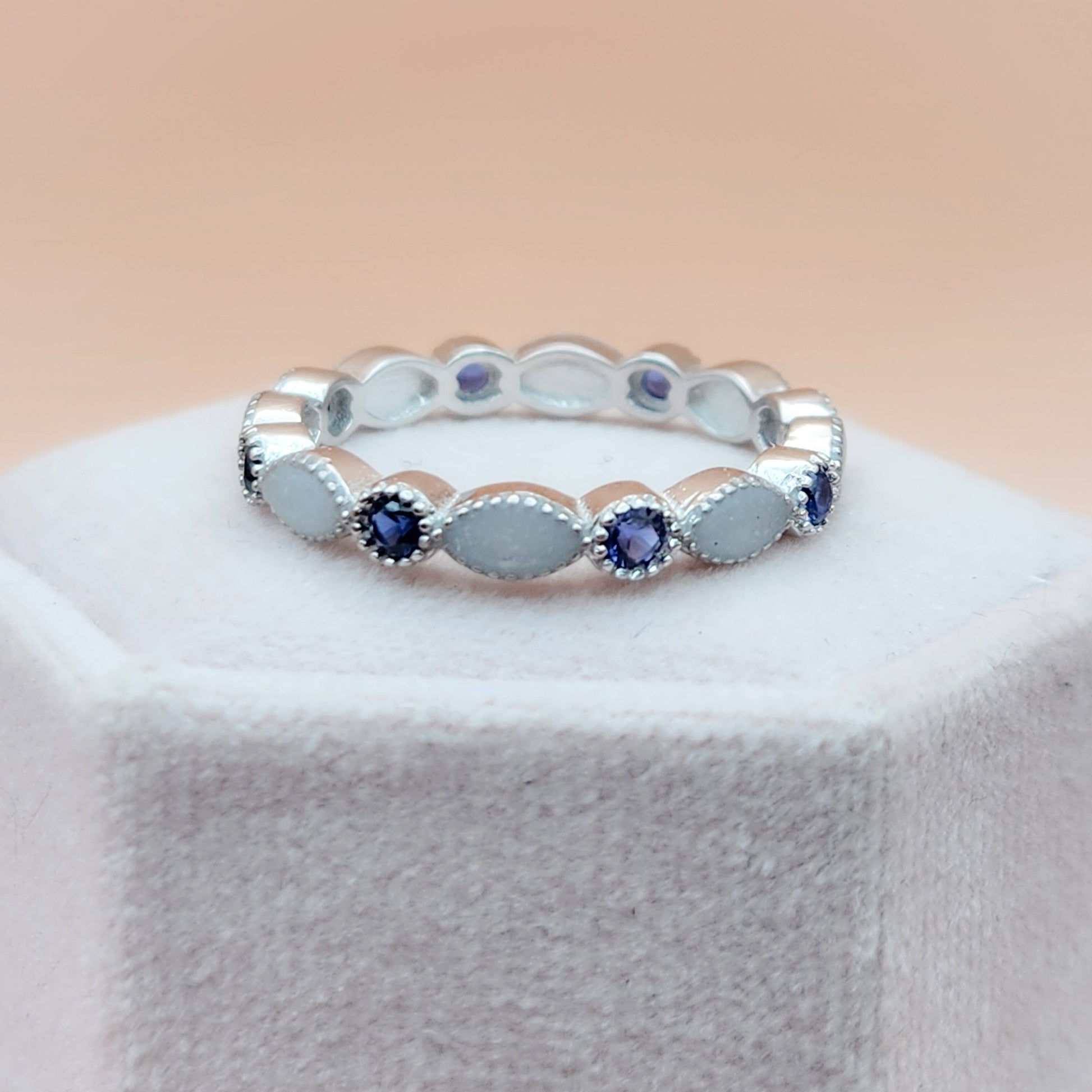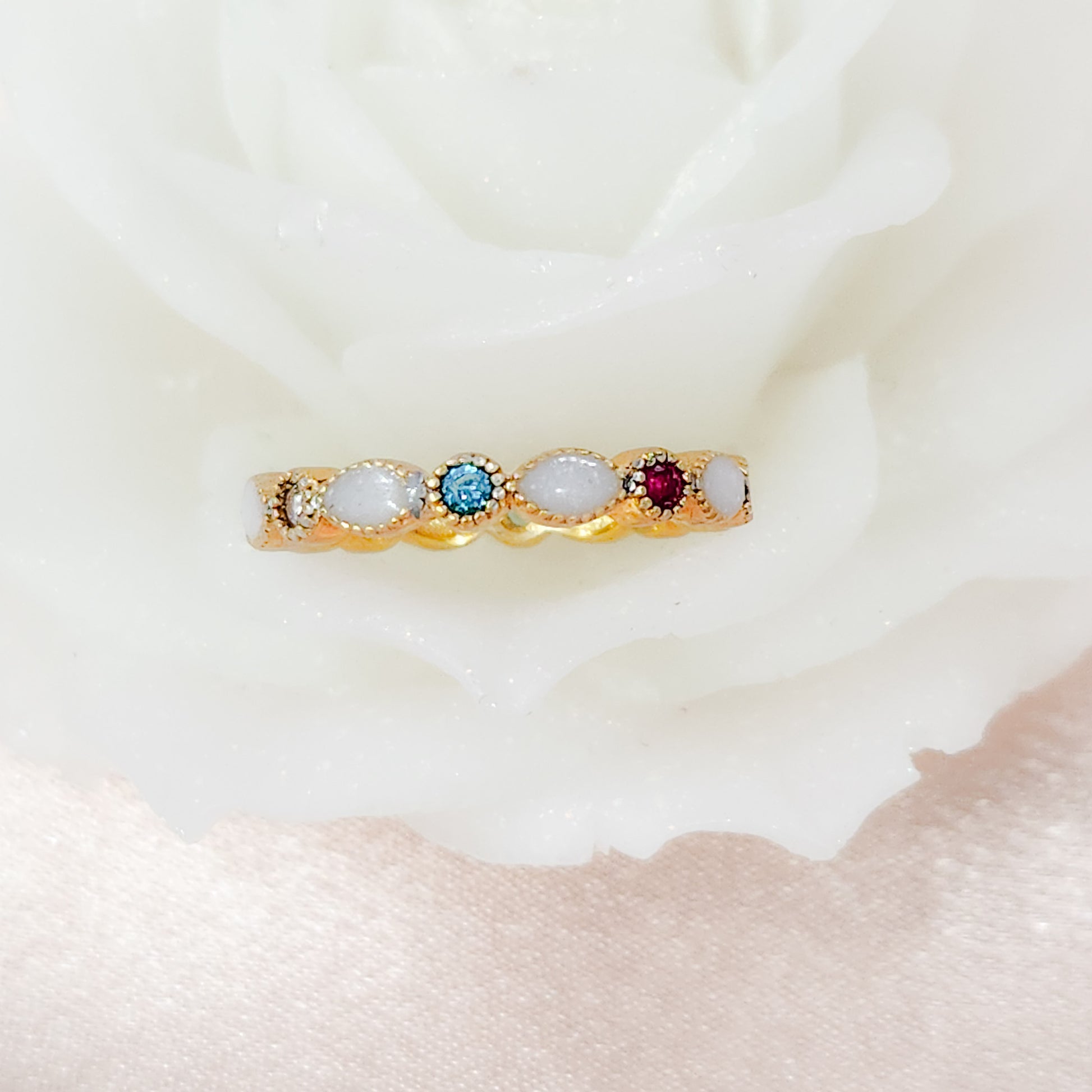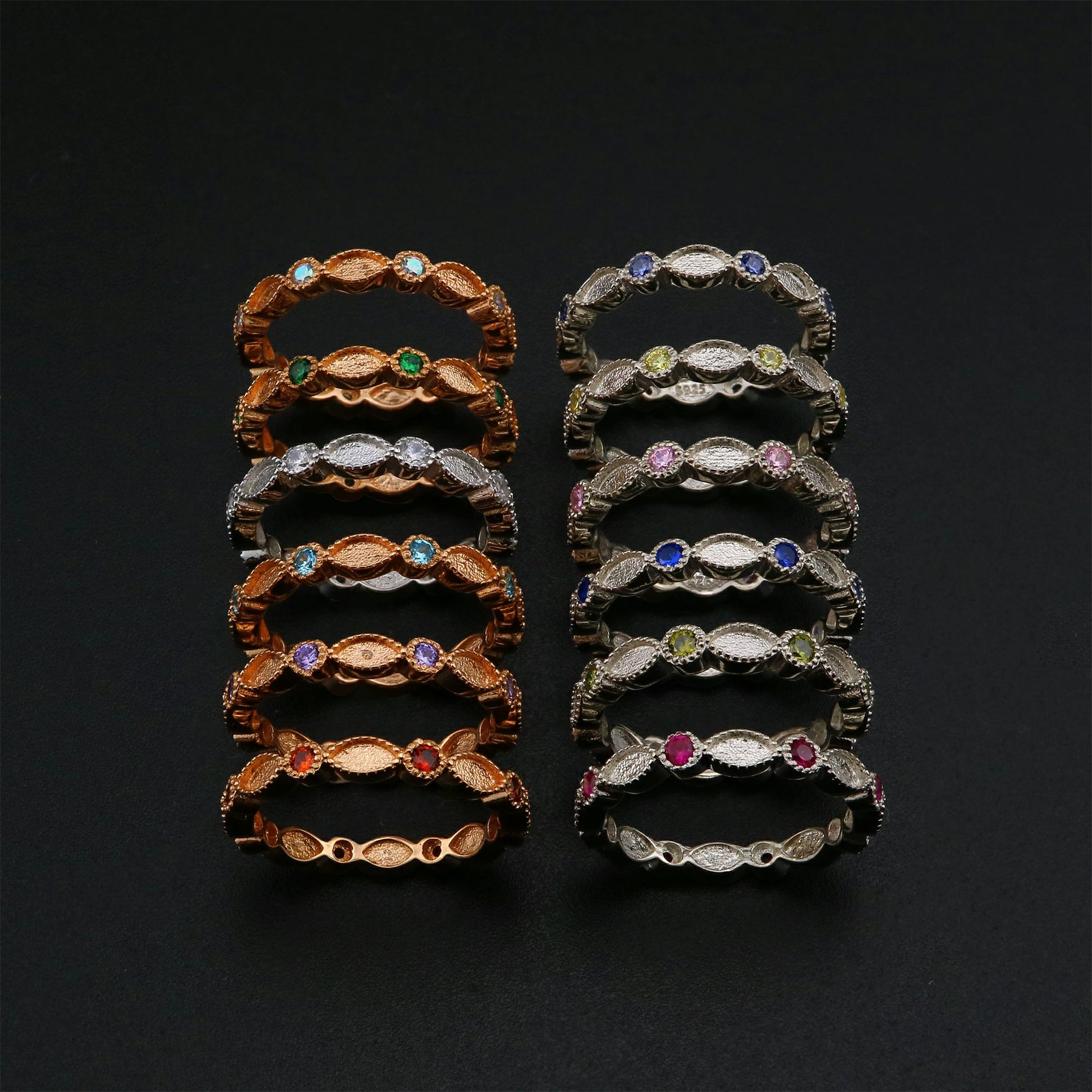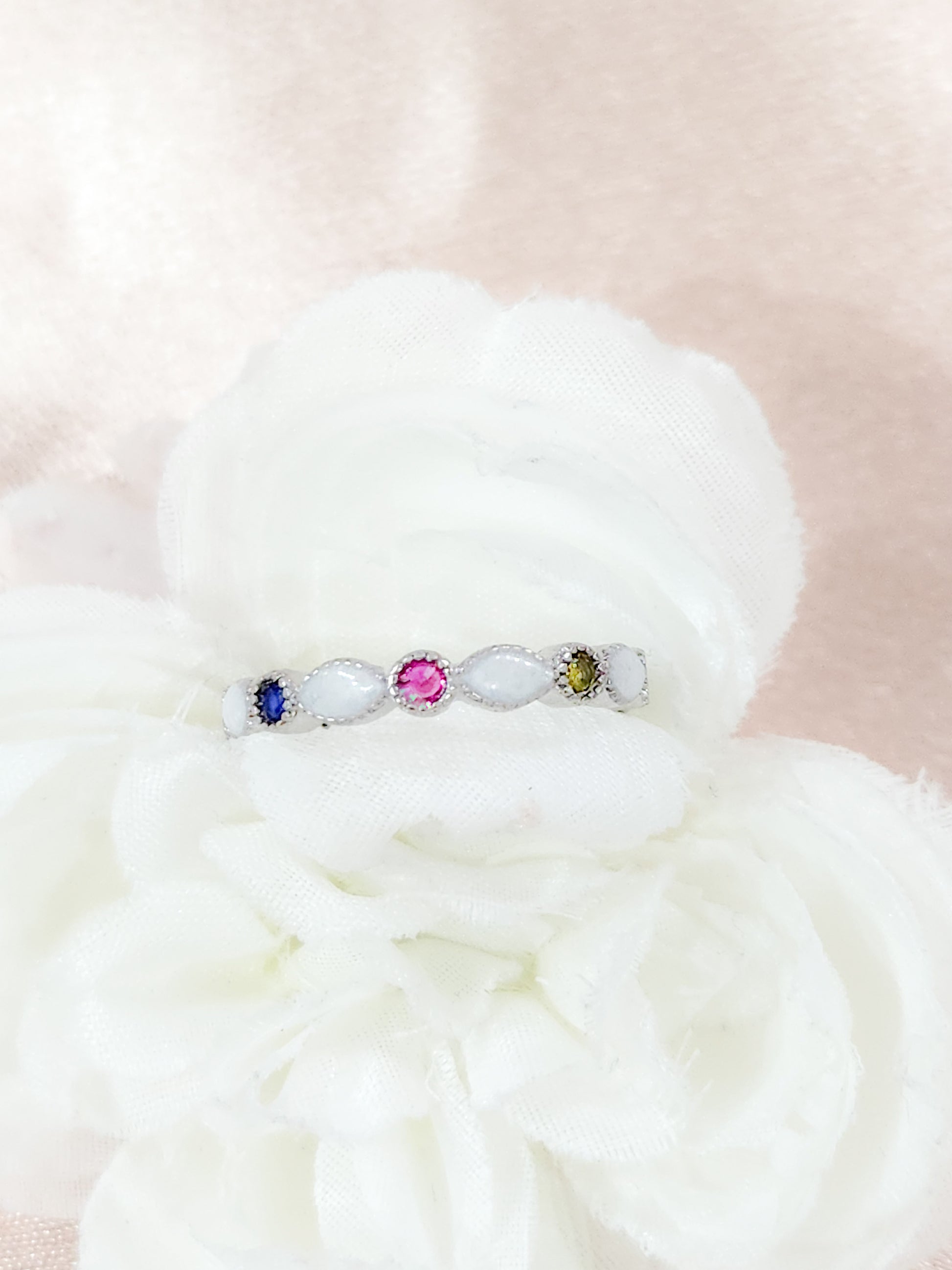 This enchanting 925 sterling silver ring features bezels around the entire ring with birthstone coloured cubic zirconia accent stones. If you would prefer to keep the stones clear please select April. This setting is available in white gold plated, gold plated or rose gold plated. Please note that you may select up to 8 birthstones for this setting.