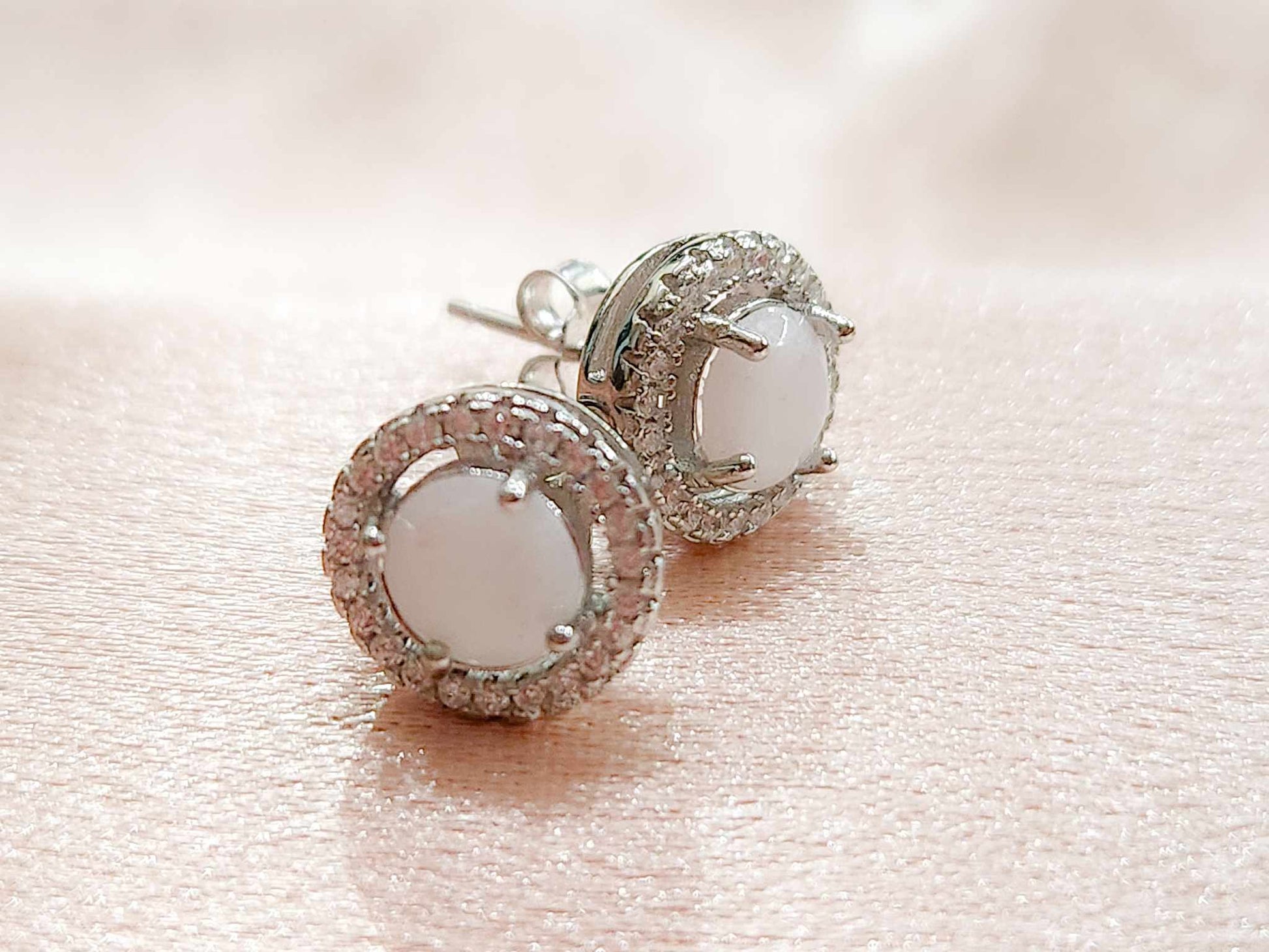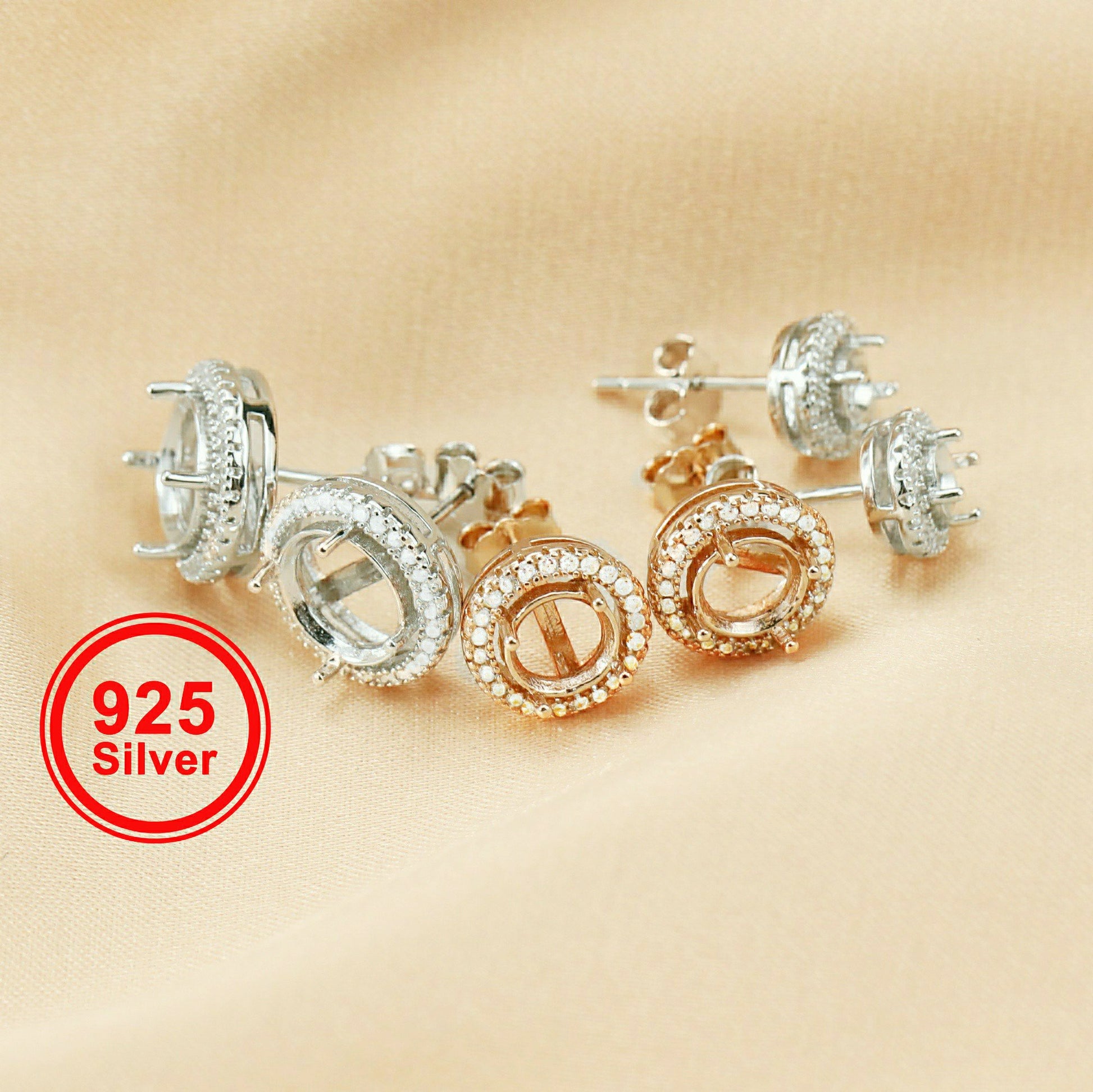 This beautiful 925 silver pair of earrings contains a 6mm round stone to be filled with your choice of inclusions. It is accented with beautiful cubic zirconia stones. This setting is available in silver or rose gold.