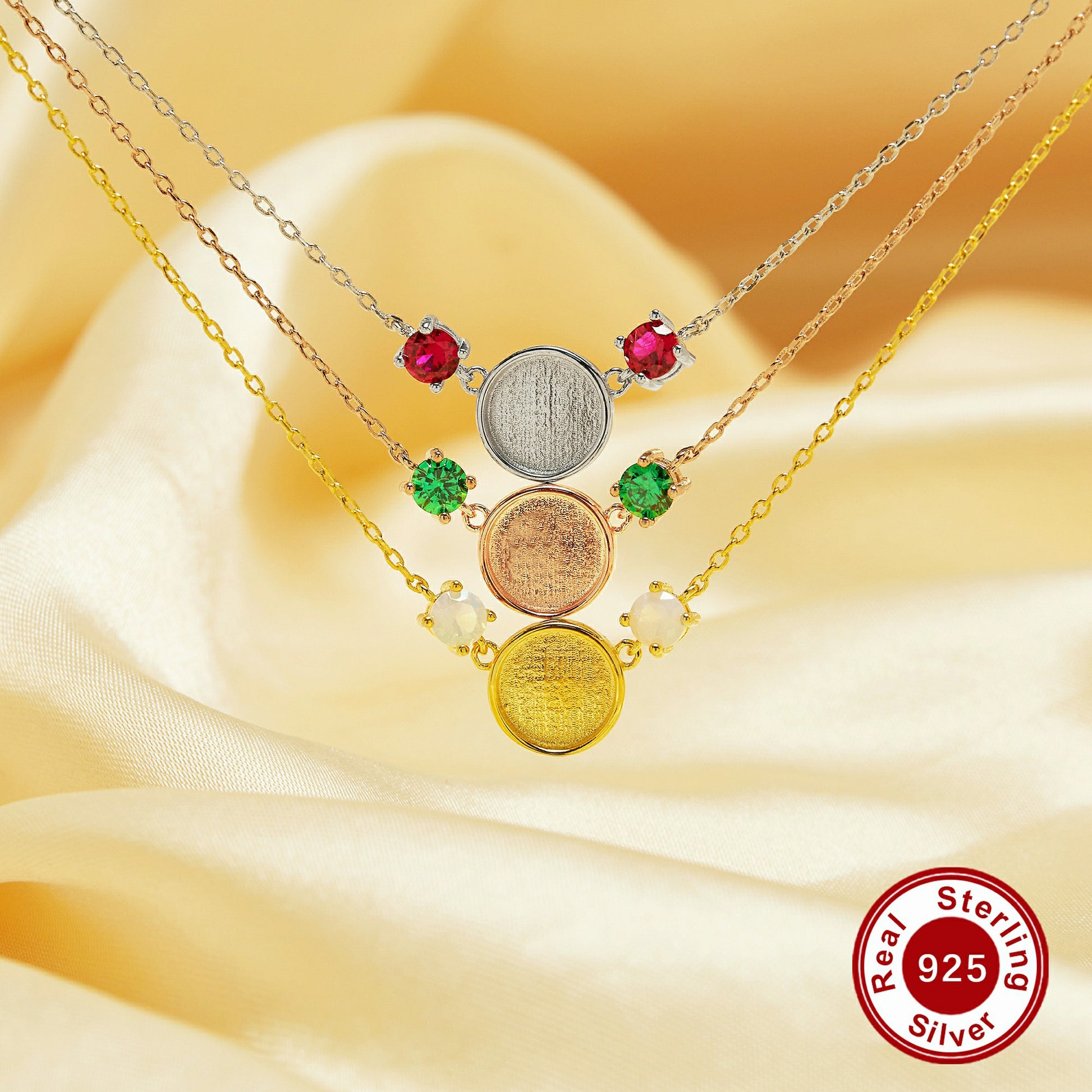 This adorable 925 sterling silver pendant contains a 8mm round bezel to be filled with your choice of inclusion. It is accented with 4mm birthstone coloured cubic zirconia accent stones. This setting is available in white gold played, rose gold plated, and yellow gold plated. This pendant comes with a 18inch, 1mm thick chain. Please note that you may select up to 2 birthstones for this setting.