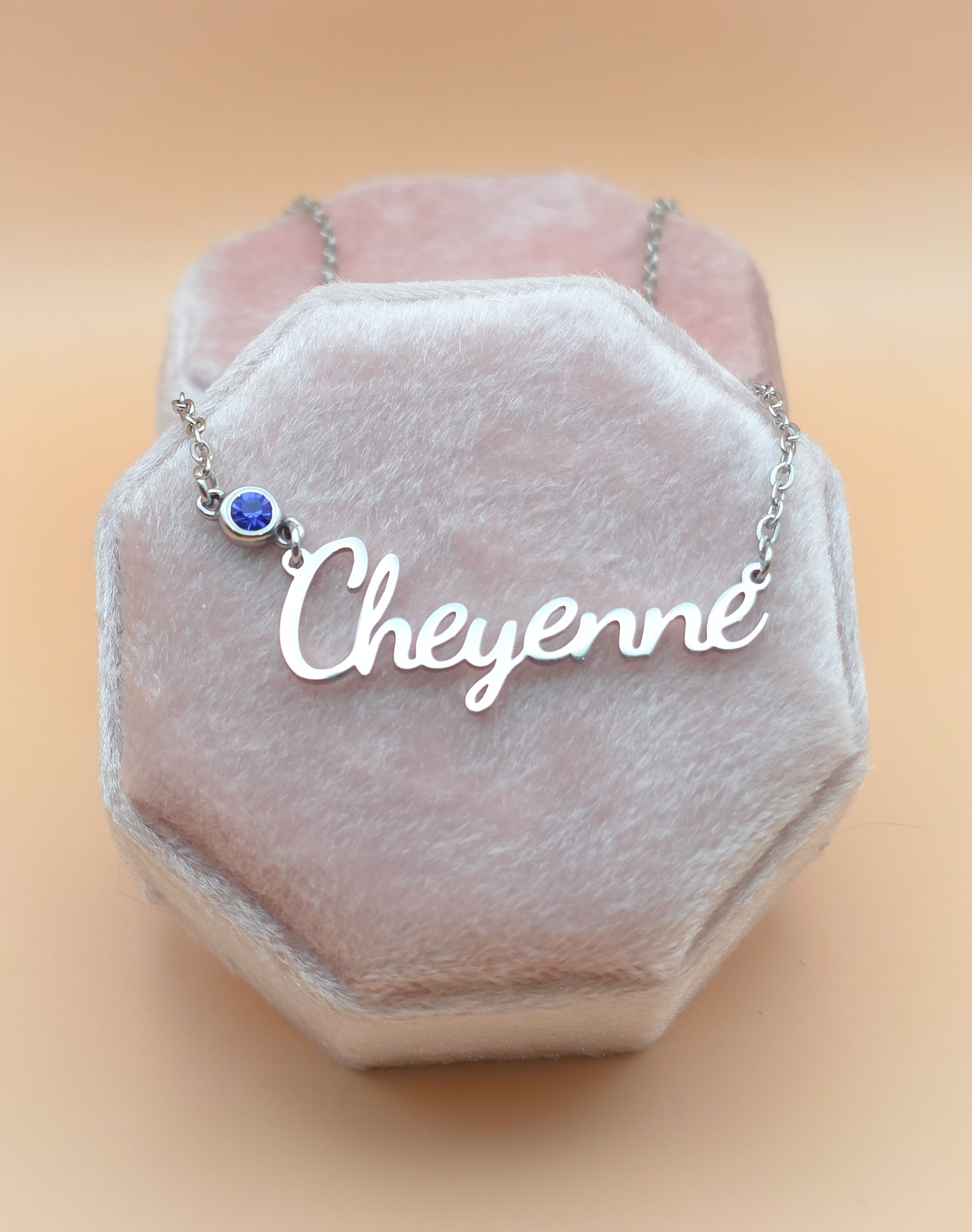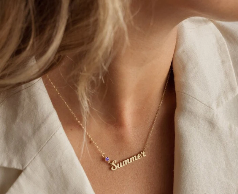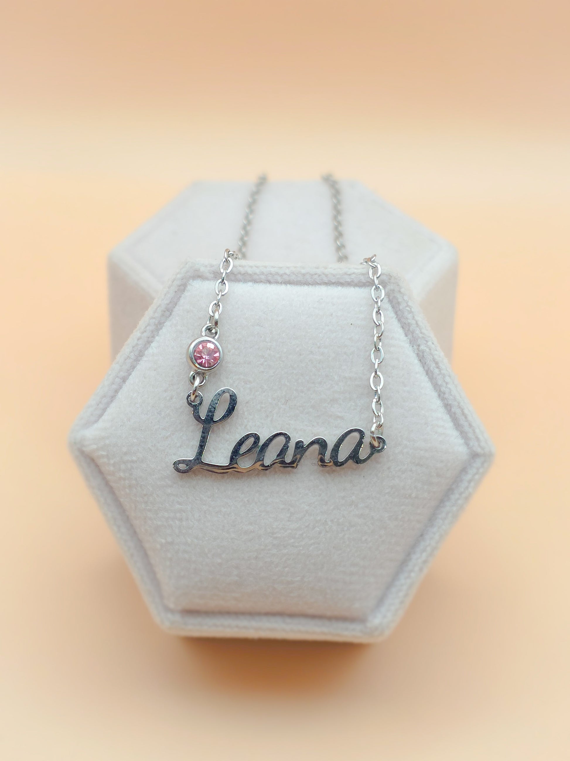 This simple and elegant necklace is made of stainless steal and can be customized to any name. It is accented with your choice of birthstone. This would be a great gift for a mom with their child's name or a great memorial piece with the name of a loved one.