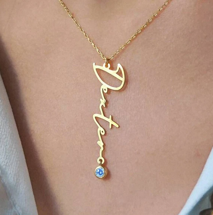This simple and elegant necklace is made of stainless steal and can be customized to any name. It is accented with your choice of birthstone. This would be a great gift for a mom with their child's name or a great memorial piece with the name of a loved one.