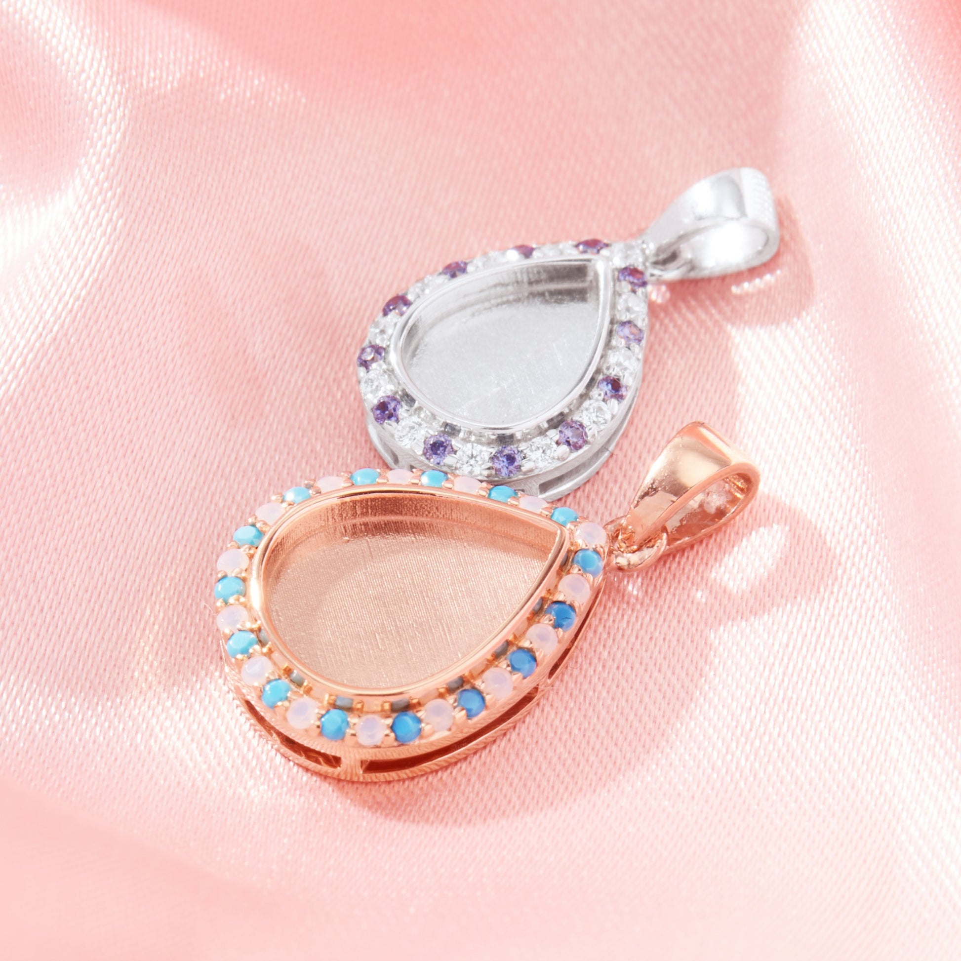 This beautiful 925 sterling silver pendant features a 5x7mm pear shaped bezel to be filled with the inclusion of your choice. It is accented with beautiful cubic zirconia birthstones. If you would prefer to keep the stones clear please select April. This setting is available in white gold plated, rose gold plated, and yellow gold plated.