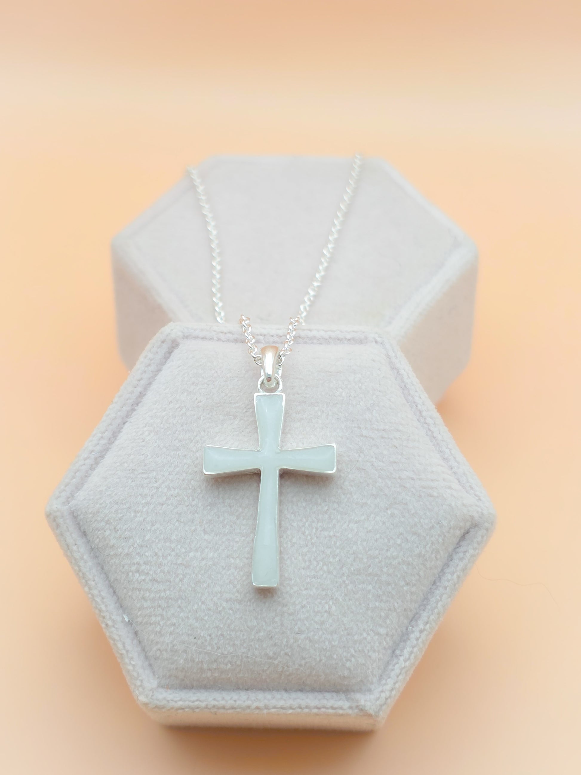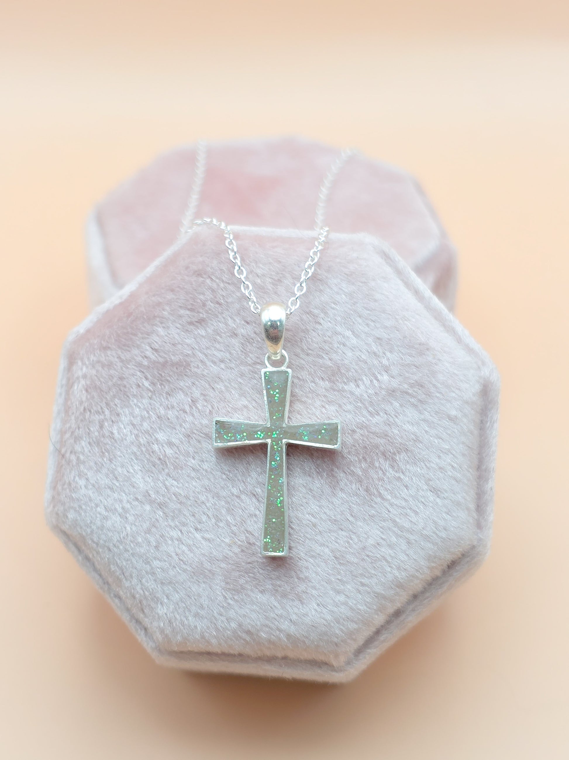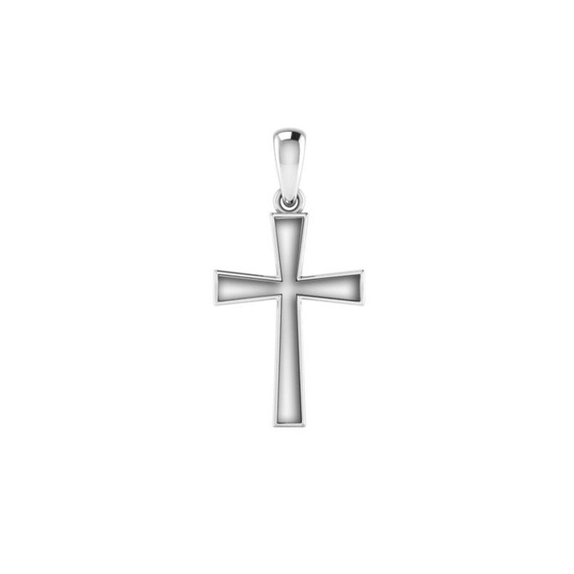 This Dainty sterling silver 15x21mm pendant contains a bezel in the shape of a cross that can be filled with your choice of inclusion. This setting is available in silver, gold rhodium, rose gold plated or black rhodium. This pendant comes with a 18inch, 1mm thick chain.