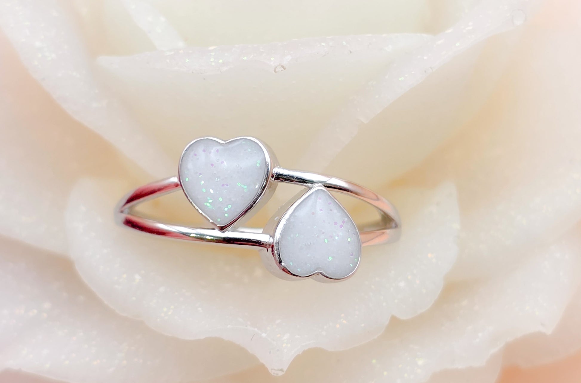 This charming 925 sterling silver ring contains two 6mm heart bezels filled with your choice of inclusion. This setting is available in white gold plated and rose gold plated.