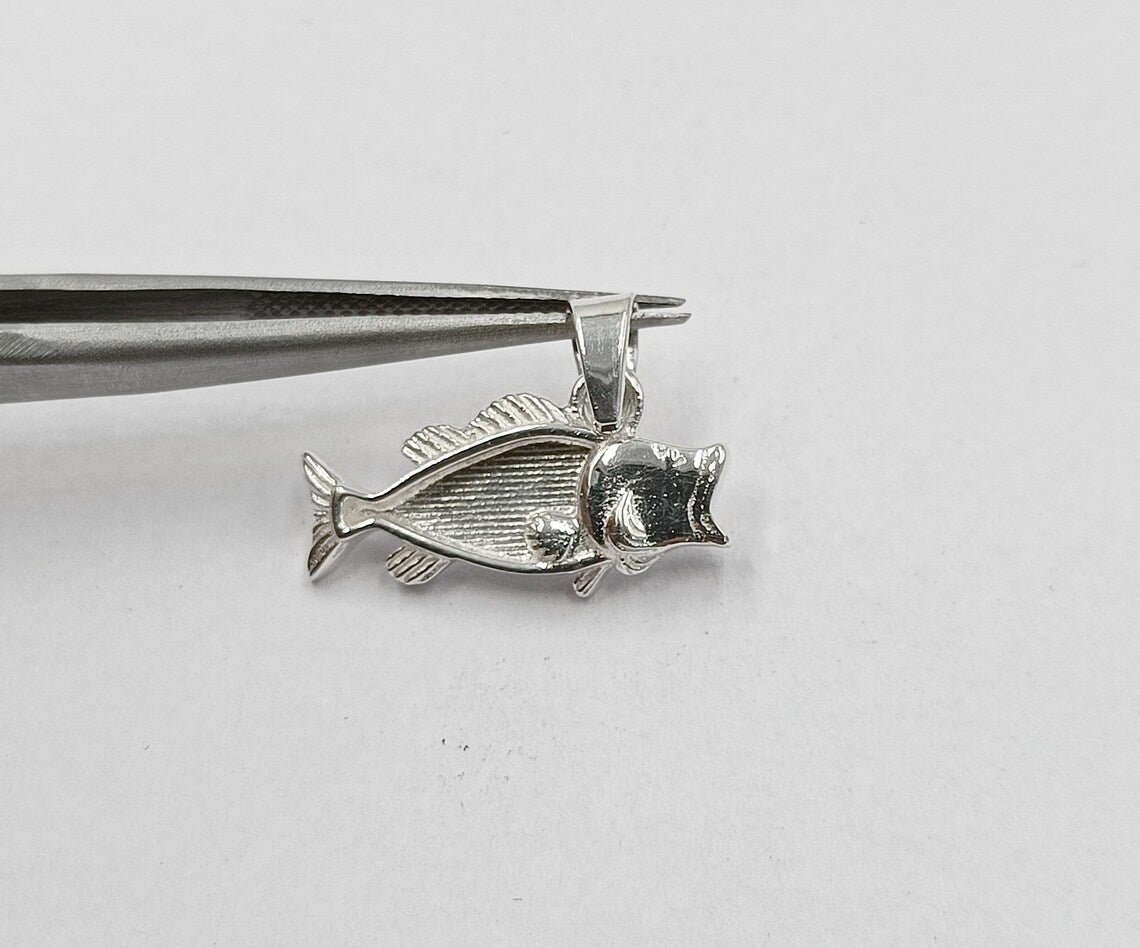 This charming sterling silver 19mm long pendant contains a bezel shape of a fish to be filled with your choice of inclusion. This setting is available in silver, yellow gold or rose gold. This pendant comes with a 18inch, 1mm thick chain.