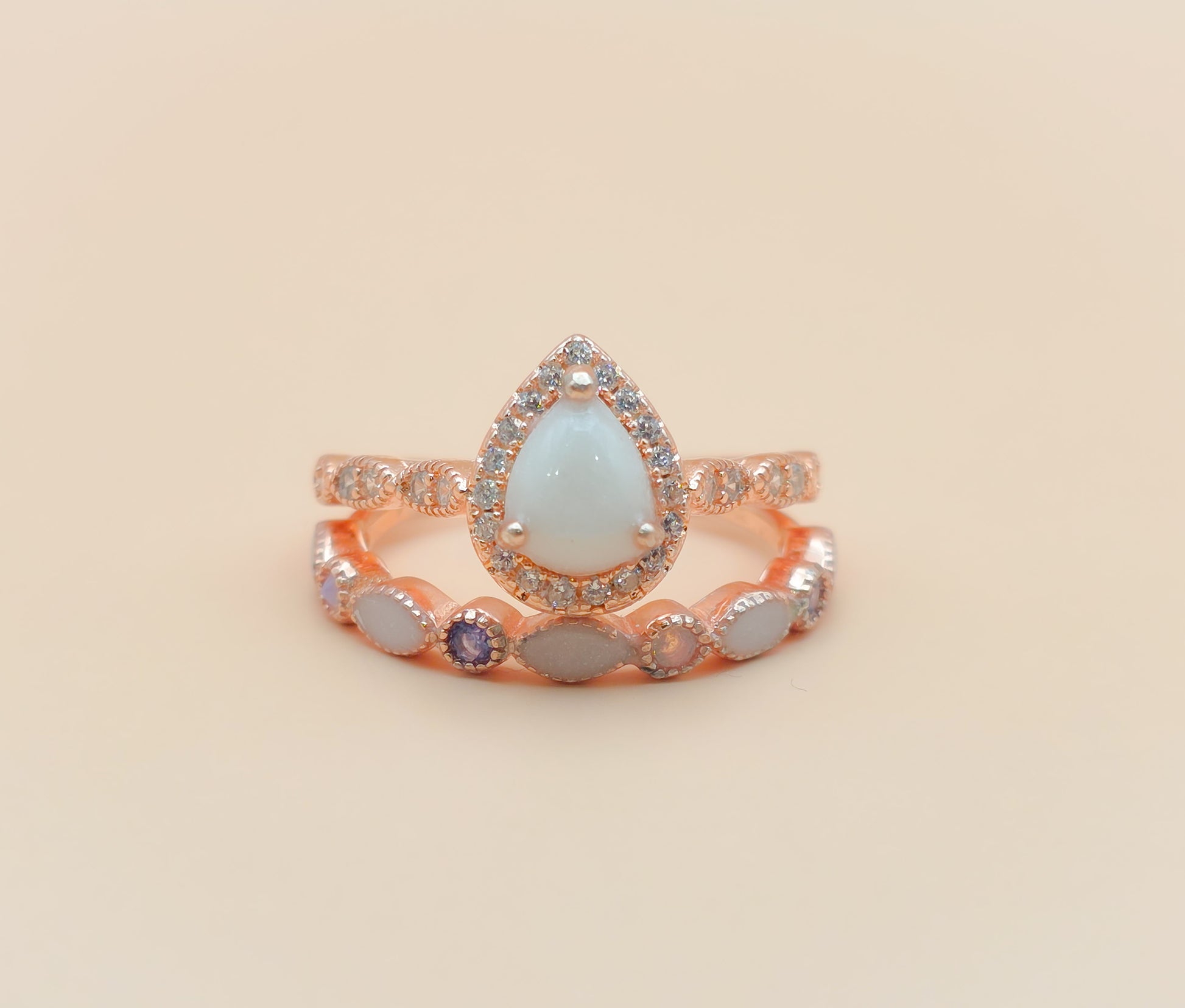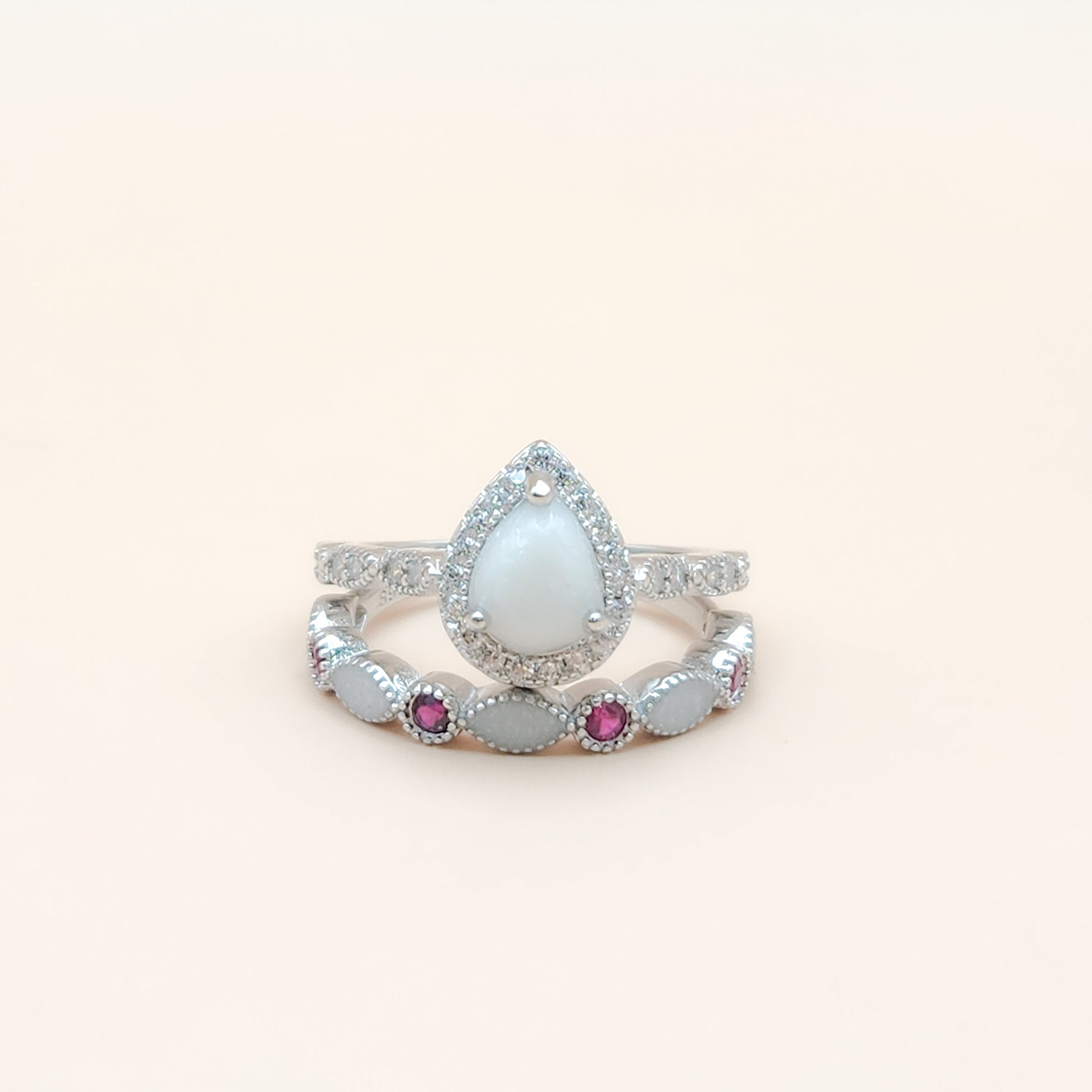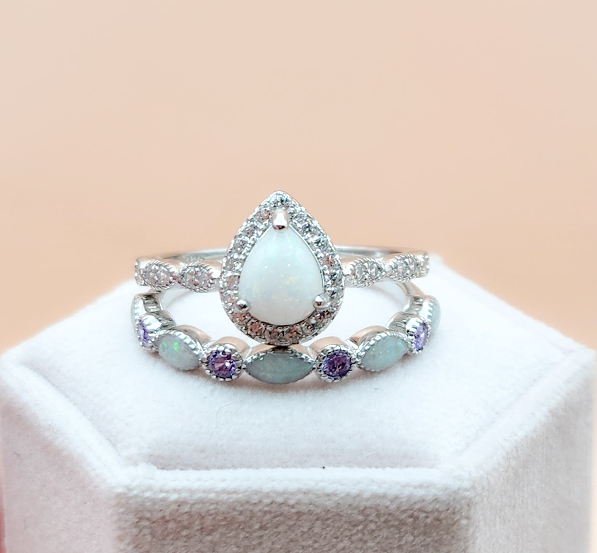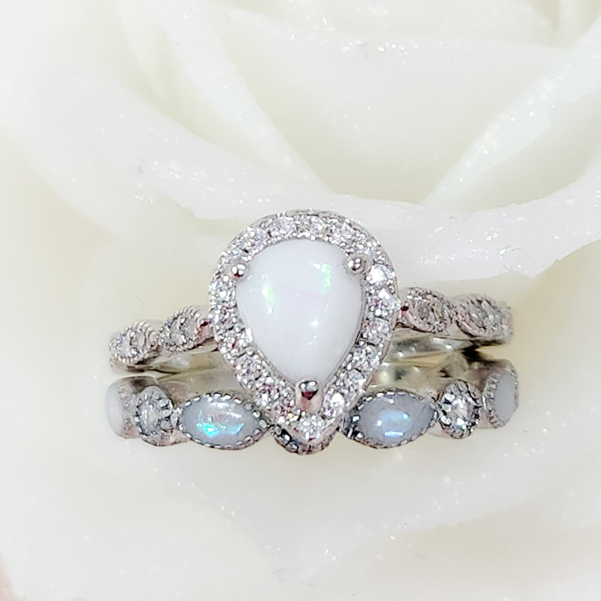 This stunning 925 sterling silver ring contains a 6x8mm pear stone with your choice of inclusion. It is accented with beautiful cubic zirconia stones. This settings is paired with our beautiful Analise half band birthstone stacker. If you would prefer to keep the stones clear please select April. This setting is available in white gold plated, and rose gold plated. Please note that you may select up to 8 birthstones for this setting.