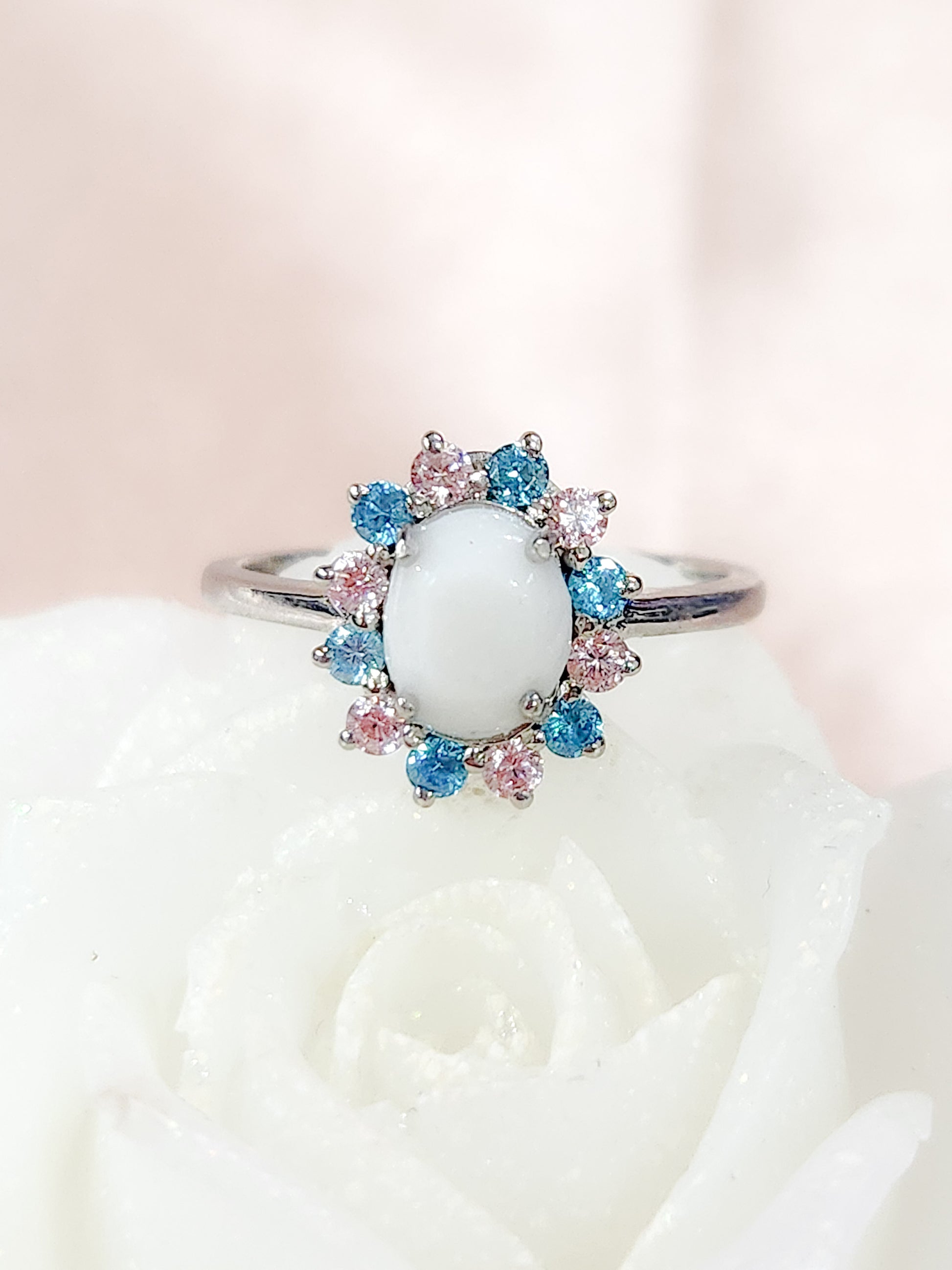 This stunning 925 sterling silver ring features a 6x8mm pear oval shape stone to be filled with the inclusion of your choice. It is accented with beautiful cubic zirconia birthstones. If you would prefer to keep the stones clear please select April. This setting is available in white gold plated, rose gold plated, and yellow gold plated.
