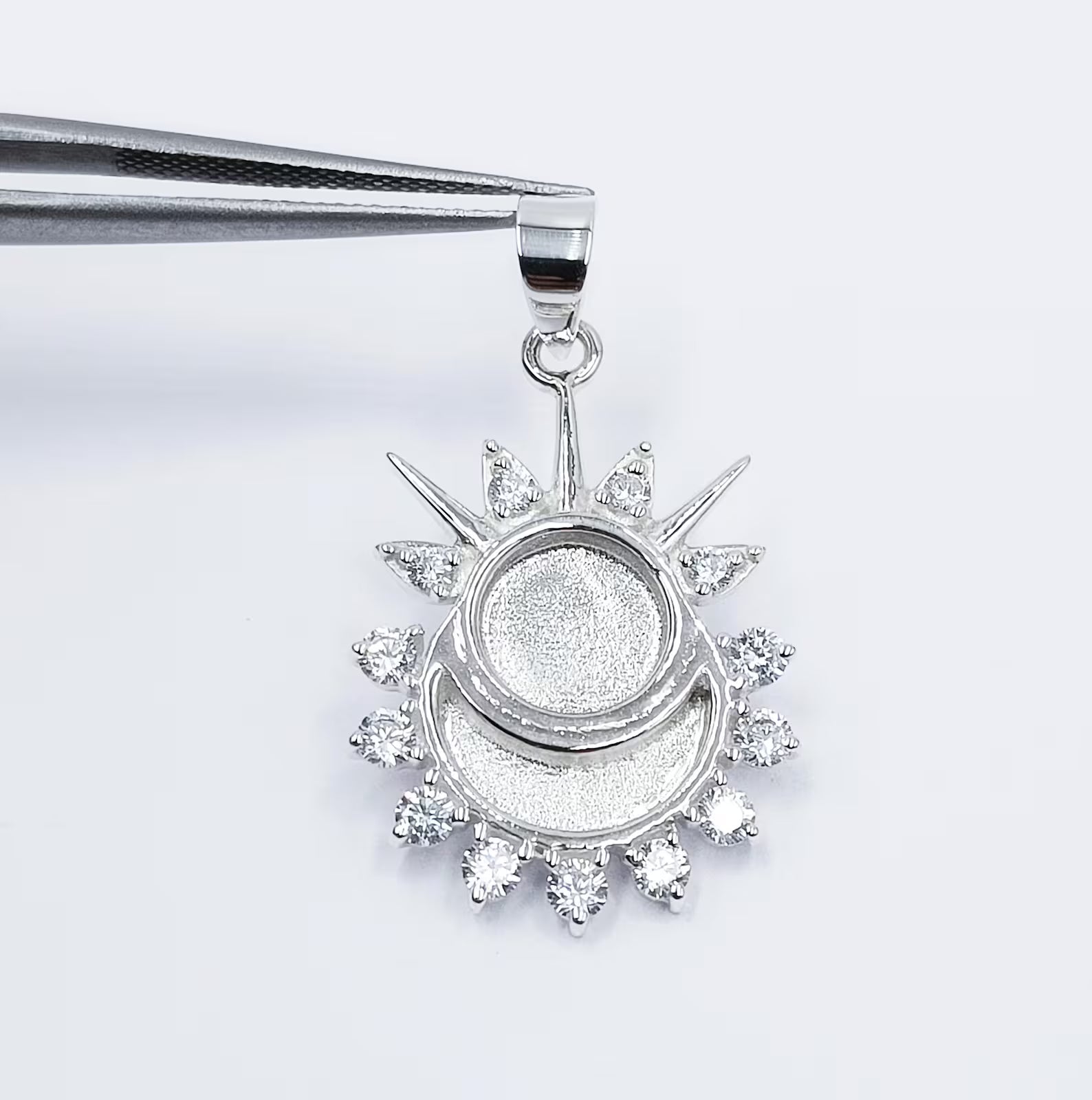 This stunning 925 sterling silver pendant contains 20x25mm bezels in the shape of a sun and moon to be filled with your choice of inclusion. This setting is available in sterling silver, rose gold plated, or yellow gold plated. This pendant comes with a 18inch, 1mm thick chain.