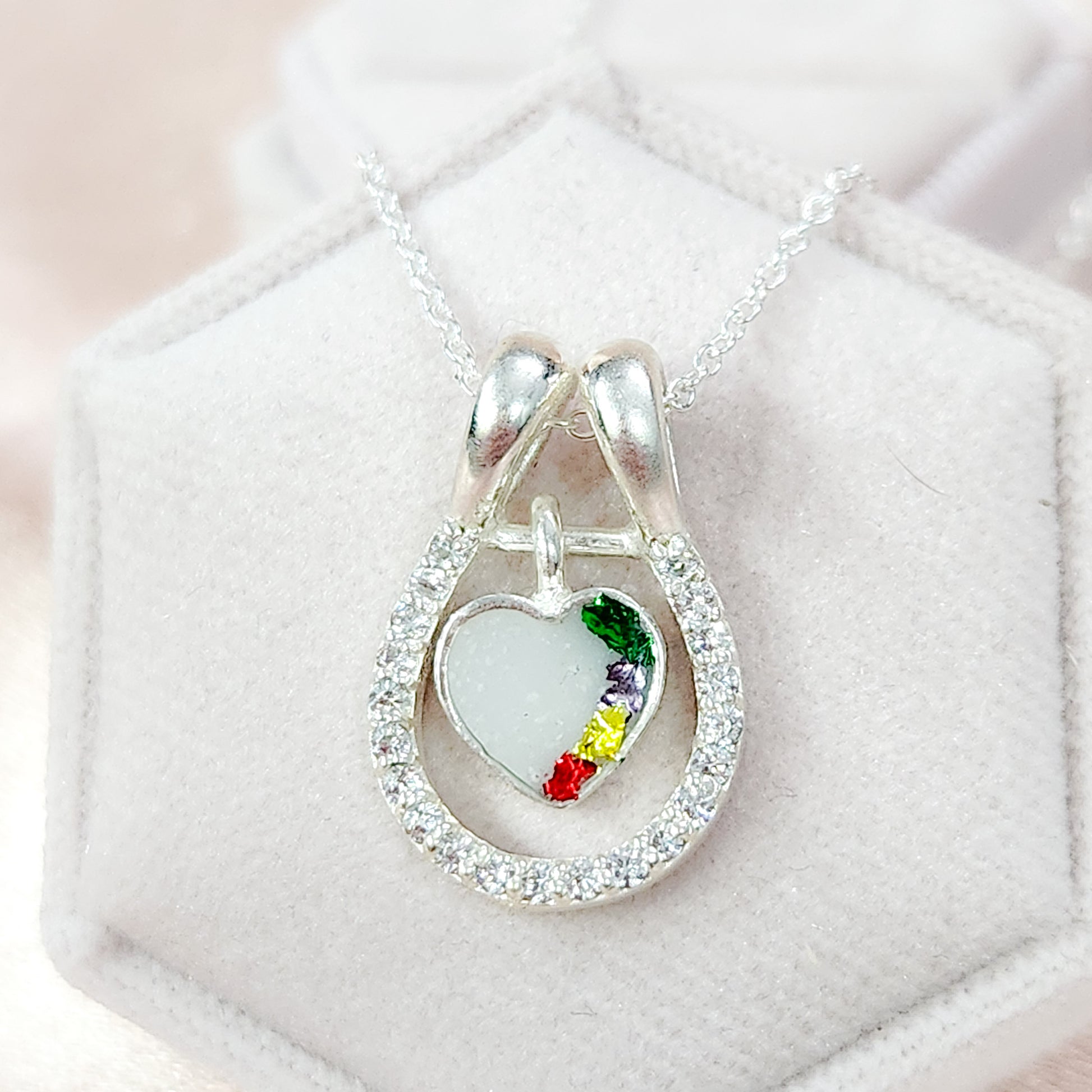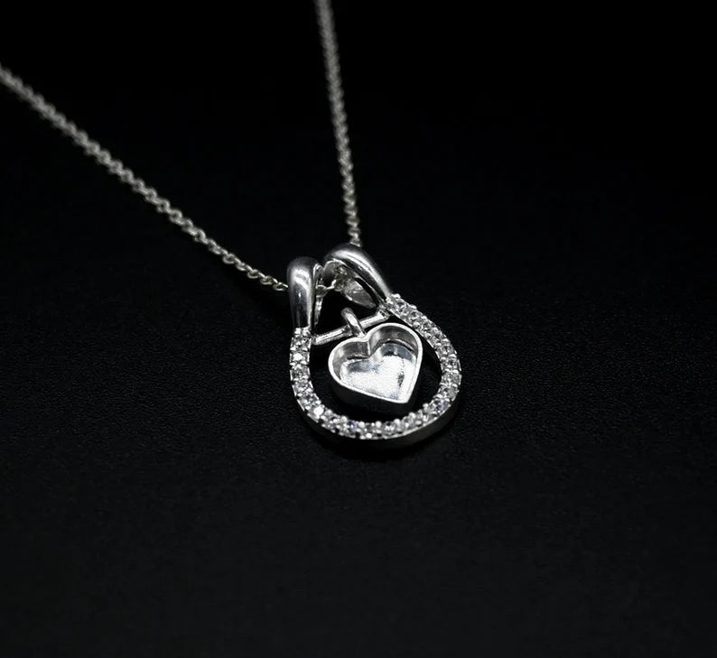 This beautiful sterling silver 7mm bezel in the shape of a heart to be filled with your choice of inclusion. This setting is available in silver, yellow gold or rose gold. It is accented with beautiful cubic zirconia stones. This pendant comes with a 18inch, 1mm thick chain.