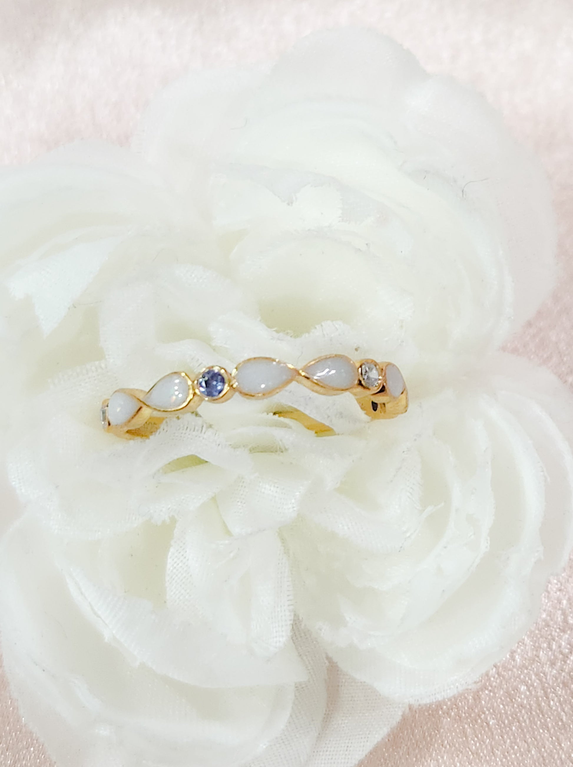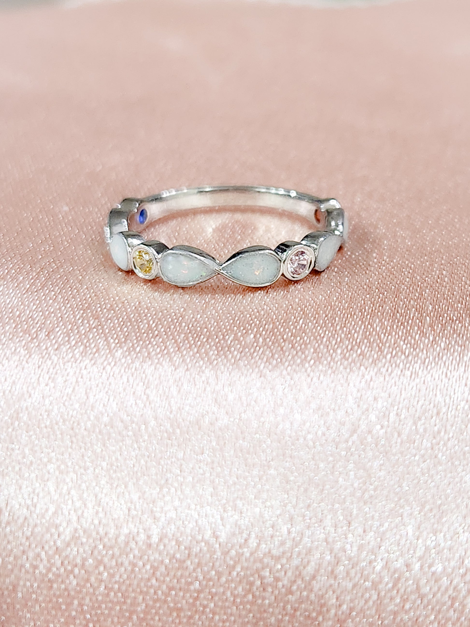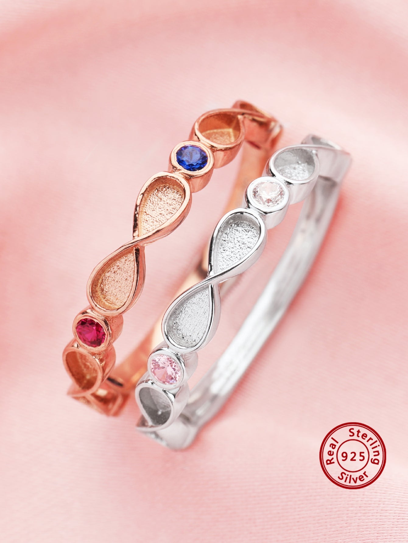 This beautiful 925 sterling silver ring features a half band of infinity shapes bezels with 4 birthstone coloured cubic zirconia accent stones. If you would prefer to keep the stones clear please select April. This setting is available in silver, gold, or rose gold plating. Please note that you may only select up to 4 birthstones for this setting.
