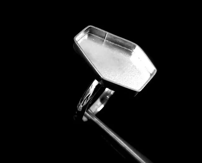 This simplistic 925 sterling silver ring features a 10x8mm coffin shaped bezel to be filled with your choice of inclusions. This setting is available in silver, yellow gold plated or rose gold plated.