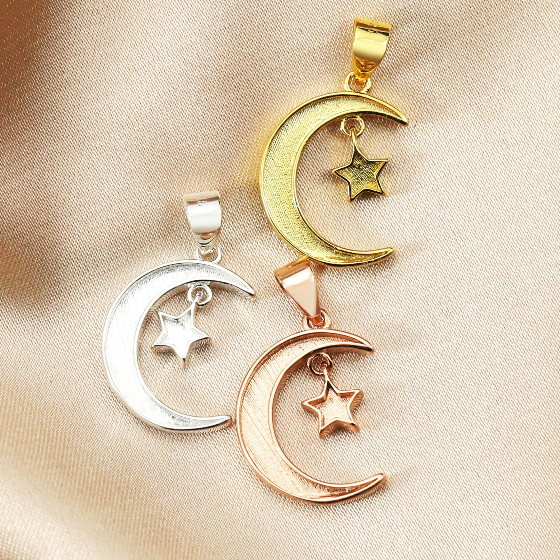 This simple sterling silver 16mm pendant contains a bezel in the shape of a moon and star that can be filled with your choice of inclusion. This setting is available in silver, gold plated, or rose gold plated. This pendant comes with a 18inch, 1mm thick chain.